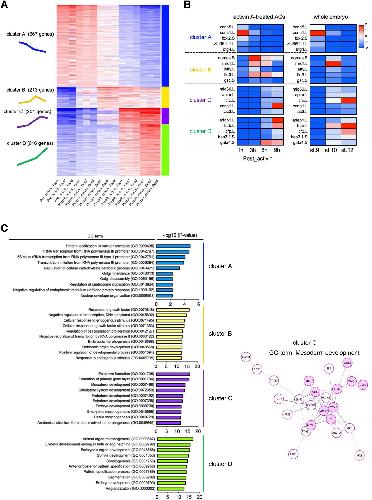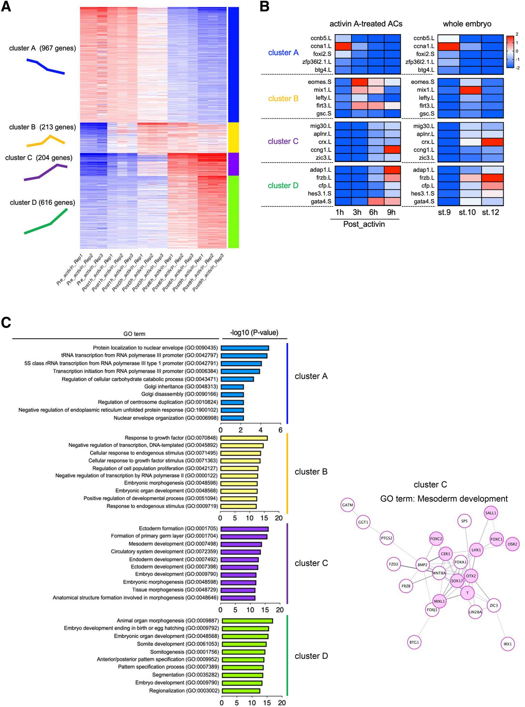 Figure 4. Clustering of gene expression trajectories. (A) K-means clustering of 2000 variable genes following activin A treatment. Genes were classified into four clusters based on similar expression patterns. Individual samples are displayed on the vertical axis, and genes on the horizontal axis. The colors in heatmap indicates relative expression of each tile (red, high; white, intermediate; blue, low expression). The heatmap was visualized using the iDEP.93 online tools (http://bioinformatics.sdstate.edu/idep/). The number of genes and schematic diagrams representing specific expression patterns in each cluster are shown on the left. (B) Heatmaps showing the gene expression of five representatives in each cluster. The expression of genes observed in activin A-treated ACs (left), and that in whole gastrula embryos (stages 9, 10 and 12) (right). The transcriptomes of the whole embryos were obtained from âSession et al.â dataset. The color scale bar is shown at the top right corner of the figure. The heatmap represents relative gene expression (red, high; white, intermediate; blue, low expression). The heatmaps were visualized using the CLC Genomic Workbench software 12.0 (QIAGEN). (C) GO enrichment analysis of genes in different clusters and the genes of cluster C assigned in the mesoderm development GO term. (left) The top ten enriched GO terms in biological processes, and the -log10 (P-value) of the significant GO terms are displayed in order of significance from the bottom of the list. Results of GO analysis in each cluster are indicated by different colors: blue, cluster A; yellow, cluster B; purple, cluster C; green, cluster D. (right) The predicted proteinâprotein interaction (PPI) network for genes in cluster C. Nodes associated with mesoderm development represent as pink circles, and other nodes as white circles. Edges are as grey lines. The thickness of connected lines indicates the strength of the interaction.