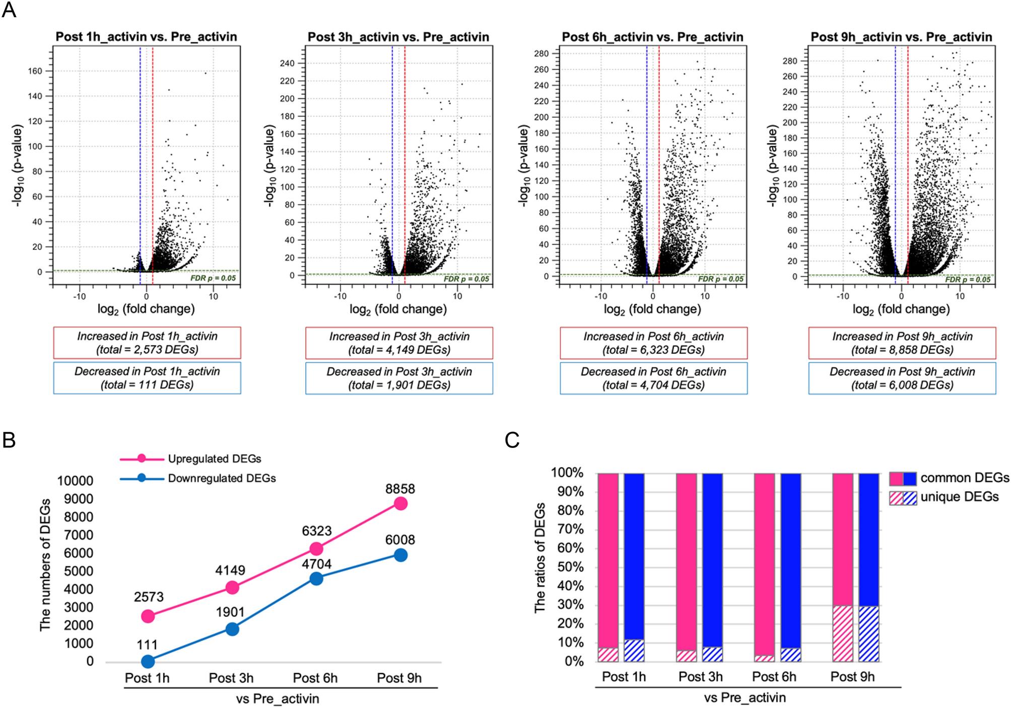 Figure 2. Differentially expressed genes (DEGs) between Pre_activin and each Post_activin sample. DEGs were identified in the comparison of gene expression between Pre_activin and each Post_activin sample based on log2 FC ≥ 2 or ≤ − 2 with FDR at p < 0.05. (A) Volcano plots representing DEGs in each comparison. Each dot represents individual DEG. Dotted vertical lines, log2 FC ≥ 2 or ≤ − 2; dotted horizontal line, the significance cut-off (p < 0.05). (B) Line graph showing the total number of upregulated and downregulated DEGs in each comparison. (C) Bar chart showing the ratio of common DEGs among different Post_activin samples and that of unique DEGs in each Post_activin sample. Common DEGs and unique DEGs are represented by solid or stripe pattern fill, respectively. (B,C) Magenta, upregulated DEGs; blue, downregulated DEGs. |