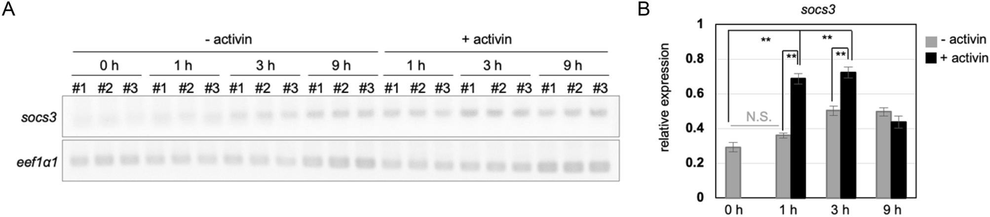Figure 5. Upregulation of socs3 in ACs following activin A treatment. Semiquantitative RT-PCR of the expression of socs3 in ACs. Dissected ACs were cultured with or without of activin A. (A) Electrophoresis gel of RT-PCR products. #1â3 indicate the three biological replicates. The upper panel shows the expression of socs3 and the lower panel shows the expression of eef1a1, which was used as the loading control. Full size images of each gel are presented in Supplementary Figure S10. For (B), the densitometry for socs3 expression. Error bars indicate s.e.m. (nâ=â3). **pâ<â0.01, p-value was calculated using Studentâs t-test after the one-way analysis of variance. N.S., not significant. (A,B) Cultivation times are indicated as follows: 0 h, 0 h (the absence of cultivation); 1 h, 1 h; 3 h, 3 h; 9 h, 9 h.
