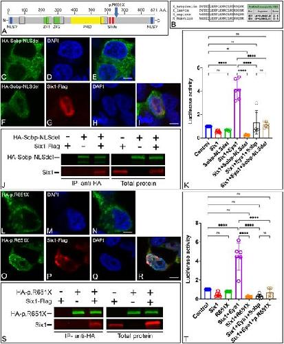 Fig. 3. Deletion of the nuclear localization signal and the p.R651X variant of sobp do not disrupt interaction with Six1. (A) Schematic representation of the Sopb protein structure showing its different domains and the location of the p.R651X variant identified in individuals with MRAMS. Black outline indicates protein domains that are highly conserved between different species, including D. melanogaster, M. musculus, G. gallus and X. laevis/tropicalis; blue boxes/NLS denote putative nuclear localization signals; green boxes/ZF1/ZF2 denote FCS zinc-finger domains; yellow box/PRD denotes proline-rich domain; red boxes/SIMs denote SUMO-interacting motifs. (B) Comparison of the C-terminal region of Sobp between species showing a highly conserved domain that is predicted to be a NLS with a high cutoff score according to cNLS mapper. (C-I) Confocal images of HEK293T cells expressing a construct lacking the C-terminal NLS (HA-Sobp-NLSdel, green, C,E,F,I). This construct is cytosolic in the majority of the transfected cells (C,E). Cells co-expressing HA-Sobp-NLSdel (green, F,I) with Six1-Flag (red, G,I) show partial translocation to the nucleus. DAPI (blue, D,E,H,I). Scale bars: 5â μm. (J) HEK293T cells were co-transfected with combinations of HA-Sobp-NLSdel and/or Six1-Flag followed by multiplex fluorescent western blot detection for HA-Sobp-NLSdel (green) and Six1 (red). Six1 was detected after HA-Sobp-NLSdel was immunoprecipitated with anti-HA magnetic beads (IP, left two rows). Right two rows show expression of the constructs before immunoprecipitation. (K) Graph depicting the luciferase activity of the pGL3-6xMEF3-luciferase reporter in HEK293T cells transfected with different combinations of constructs expressing Six1, Eya1, Sobp and/or Sobp-NLSdel. The C-terminal NLS is not required for repression of the transcriptional activation of the Six1+Eya1 reporter (control versus Six1+Eya1+Sobp-NLSdel, P=0.9959; Six1+Eya1+Sobp versus Six1+Eya1+Sobp-NLSdel, P=0.9912). ns, not significant; *P<0.05, ****P<0.0001. Experiments were repeated in duplicate at least three independent times. Error bars represent s.d. with circles depicting individual data points. (L-R) Confocal images of HEK293T cells expressing the p.R651X variant of sobp (HA-p.R651X, green, L,N,O,R). The variant is cytosolic in the majority of transfected cells (L,N). Cells co-expressing p.R651X (green, O,R) and Six1-Flag (red, P,R) show partial translocation of HA-p.R651X to the cell nucleus. Cell nuclei are stained with DAPI (M,N,Q,R). Scale bars: 5â μm. (S) HEK293T cells were co-transfected with combinations of HA-p.R651X and/or Six1-Flag followed by multiplex fluorescence western blot detection for HA-p.R651X (green) and Six1 (red). Six1 was detected after HA-p.R651X was immunoprecipitated with anti-HA magnetic beads (IP, left two rows). Right two rows show expression of the constructs before immunoprecipitation. (T) Graph depicting the luciferase activity of the pGL3-6xMEF3-luciferase reporter in HEK293T cells transfected with different combinations of constructs expressing Six1, Eya1, Sobp and/or p.R651X. Truncated Sobp (p.R651X) is still able to repress the transcriptional activation of the Six1+Eya1 reporter (control versus Six1+Eya1+p.R651X, P=0.8603; Six1+Eya1+Sobp versus Six1+Eya1+p.R651X, P=0.9362). Experiments were repeated in duplicate at least three independent times. Error bars represent s.d. with circles depicting individual data points. ns, not significant; ****P<0.0001. |
