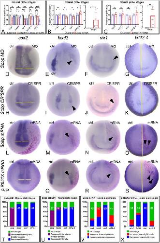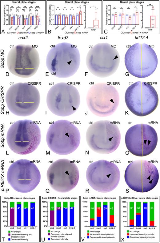 Fig. 4. Sobp is required for proper formation of the embryonic ectodermal domains at neural plate stages. (A) qPCR analysis of whole neural plate embryos injected with MO or after CRISPR shows that Sobp KD caused a significant decrease in the mRNA levels for foxd3 (MO, â¼33%; CRISPR, â¼20%) and six1 (MO, â¼40%; CRISPR, â¼32%) relative to uninjected control embryos, whereas changes in sox2 or krt12.4 were not significant. Levels of sobp mRNA verified reduced transcripts after CRISPR (MO, not significant; CRISPR, â¼50% decrease). (B) qPCR analysis of whole embryos injected with sobp mRNA shows that increasing Sobp (â¼50-fold increase) significantly reduced mRNA levels for foxd3 (â¼20%) and six1 (â¼20%), and increased that of krt12.4 (â¼1.3 fold), whereas sox2 levels were not significantly affected. (C) qPCR analysis of whole embryos injected with p.R651X mRNA shows that increased expression (â¼80-fold increase) significantly reduced mRNA levels for six1 (â¼25%) and increased that of krt12.4 (â¼1.3 fold), whereas foxd3 and sox2 levels were not significantly affected. ns, not significant; *P<0.05, **P<0.01, ***P<0.001, ****P<0.0001. qPCR experiments were repeated at least four independent times. Error bars represent s.d. with symbols depicting individual data points. (D-S) In situ hybridization for sox2 (neural plate, D,H,L,P), foxd3 (neural crest, E,I,M,Q), six1 (PPE, F,J,N,R) and krt12.4 (epidermis, G,K,O,S). Images are representative of the most frequent phenotype, except for krt12.4 in O and S. Knockdown of Sobp on one side in morphants (MO, D-G) or F0 crispants (CRISPR, H-K) reduced the intensity of sox2 expression concomitant with expansion of its domain, indicated by yellow lines (D,H). They also reduced expression of foxd3 (arrowheads, E,I), six1 (arrowheads, F,J) and krt12.4 (indicated by distance from the midline, yellow line, G,K). Increased expression of Sobp (L-O) or the p.R651X variant of sobp (P-S) on one side caused a decrease in the expression of foxd3 (arrowheads, M, Q) and six1 (arrowheads, N,R), whereas sox2 expression was unchanged (L,P). Although krt12.4 expression was unchanged in most embryos, we detected ectopic expression overlapping the lineage tracer (arrowheads, O,S). (T-X) Frequencies of changes in gene expression illustrated in D-S. The number in each bar denotes sample sizes. |