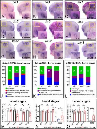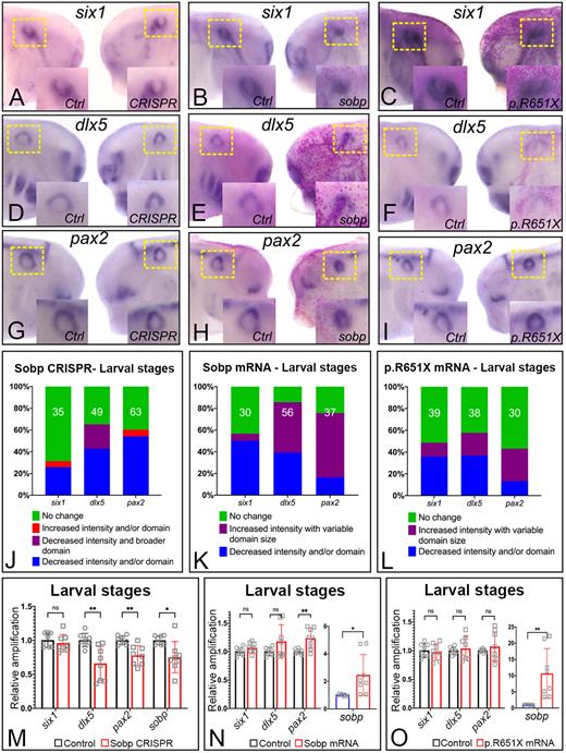 Fig. 5. Dorsal-ventral patterning of the otic vesicle requires proper expression levels of Sobp. (A-I) In situ hybridization for six1 (A-C), dlx5 (D-F) and pax2 (G-I) at larval stages. Images in each box are the control and injected sides of the same embryo, and are representative of the most frequent phenotype for CRISPR (A,D,G) and sobp mRNA (B,E,H). Images for p.R651X mRNA represent the less frequently observed phenotype (C,F,I). Insets show a higher magnification of the otic vesicle. Yellow dotted boxes denote the areas contained in the insets. Sobp knockdown leads to decreased otic expression of dlx5 (D) and pax2 (G), whereas six1 expression is unchanged (A). Increased Sobp causes a decrease in six1 expression (B) and increased expression with a variable domain size of dlx5 (E) and pax2 (H). Less frequently, increased p.R651X Sobp expression caused a decrease in six1 (C) and dlx5 (F) and increased expression of pax2 (I). (J-L) Frequencies of changes in gene expression illustrated in A-I. The number in each bar denotes the sample size. (M) qPCR analysis of whole larval heads after CRISPR (â¼25% decrease in sobp mRNA) shows significant decrease in dlx5 (â¼34%) and pax2 (â¼22%) mRNAs, whereas changes in six1 are not significant. (N) qPCR analysis of whole larval heads injected with sobp mRNA (â¼2.5-fold increase) shows a significant increase in pax2 (â¼1.4 fold); changes in six1 and dlx5 are not significant. (O) qPCR analysis of whole larval heads injected with p.R651X mRNA (â¼10-fold increase) shows no significant changes in six1, dlx5 or pax2. ns, not significant; *P<0.05, **P<0.01. qPCR experiments were repeated at least four independent times. Error bars represent s.d. with symbols depicting individual data points. |