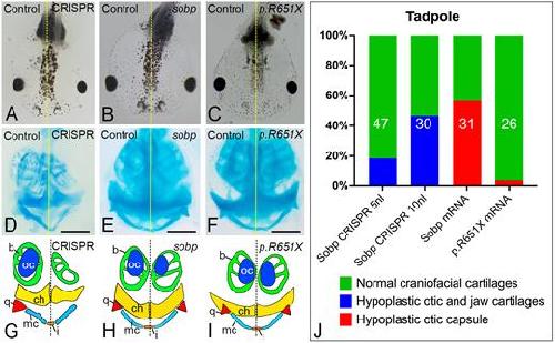 Fig. 6. Sobp is required for craniofacial cartilage development. (A-C) Gross morphology of tadpoles after unilateral CRISPR knockdown (5â nl, A), increased sobp (B) or increased p.R651X variant of sobp (C). Survival rates were: CRISPR 5â nl, â¼65.9%; 10â nl, â¼40.0%; sobp mRNA, â¼96.3%; p.R651X mRNA, â¼87.2%. Hypoplasia of head structures on the injected side is noticeable from a dorsal view in a subset of Sobp crispants (A) and increased Sobp (B), but not of increased p.R651X (C). (D-I) Ventral views of Alcian Blue staining of tadpoles (D-F) and drawings of the stained cartilages (G-I) show severe cranial cartilage defects of crispants (5â nl, 18.6%, D,G; 10â nl, 46.7%), including deformed Meckel's (mc) and ceratohyal (ch) cartilages, hypoplastic branchial arch cartilages (b), absent quadrate (q) and absent otic capsule (oc) cartilages. Increased sobp (E,H) resulted in hypoplasia of the otic capsule (56.6%), whereas the majority of the p.R651X mRNA-injected tadpoles (96.2%, F,I) did not have apparent defects. i, infrarostral cartilage. Scale bars: 500 μm. (J) Frequencies of defects in the cranial cartilages depicted in D-I. The number in each bar denotes the sample size. |