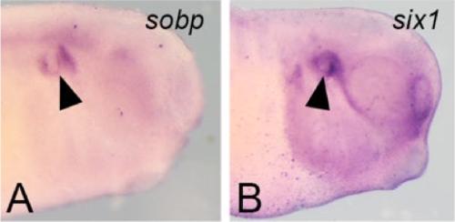 Fig. S1. In situ hybridization for sobp and six1 at larval stages. Whole-mount view of embryos sectioned in Fig. 1C (sobp) and D (six1) showing expression in the otic vesicle (arrowheads) |