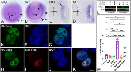 Fig. 1. Sobp is expressed with Six1 in the cell nucleus and represses the transcriptional activation of Six1+Eya1 target genes. (A-D) In situ hybridization for sobp (A,C) and six1 (B,D). At neural plate stages (A,B), although sobp expression in the PPE overlaps with that of six1, its expression is more intense in the anterior domain (arrow), whereas six1 expression is more intense in the posterior domain (arrowhead). In transverse sections through the larval otic vesicle (C,D), sobp is expressed with six1 in the ventral-medial wall. sobp expression is more intense at the dorsal pole (arrowhead). D, dorsal; ep, epidermis; L, lateral; M, medial; np, neural plate; ppe, pre-placodal ectoderm; V, ventral. (E-K) Confocal images of HEK293T cells expressing HA-Sobp (green, E-G) and cells co-expressing HA-Sobp (green) and Six1-Flag (red) (H-K). Sobp is localized in the cell nuclei in both the absence and presence of Six1-Flag. Cell nuclei are stained with DAPI (blue, F,G,J,K). Scale bars: 5â μm. (L) HEK293T cells were co-transfected with combinations of HA-Sobp and/or Six1-Flag followed by multiplex fluorescence western blot detection for HA-Sobp (green) and Six1-Flag (red). Six1 was detected after HA-Sobp was immunoprecipitated with anti-HA magnetic beads (IP, left two rows). Right two rows show expression of the constructs prior to immunoprecipitation. (M) Graph depicting the luciferase activity of the pGL3-6xMEF3-luciferase reporter in HEK293T cells transfected with different combinations of constructs expressing Six1, Eya1 and/or Sobp. Data are normalized to Renilla expressed with a constitutive promoter. Luciferase activity is significantly induced (P<0.0001) by Six1+Eya1, whereas Sobp reduces this induction to levels indistinguishable from control (Six1+Eya1 versus Six1+Eya1+Sobp, P<0.0001; control versus Six1+Eya1+Sobp, P=0.2226). Six1 (P=0.9984), Sobp (P=0.9184) and Six1+Sobp (P=0.9184) did not cause any significant changes in luciferase activity compared with control. ns, not significant; *P<0.05, **P<0.01, ****P<0.0001. Experiments were repeated in duplicate at least three independent times. Error bars represent s.d. with circles depicting individual data points. |