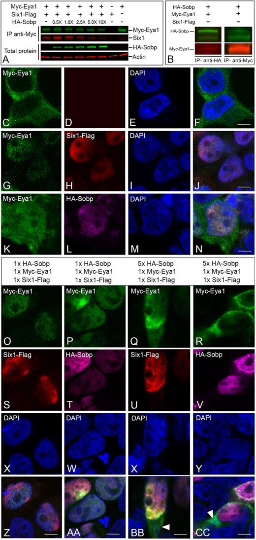 Fig. 2. Sobp reduces the transcriptional activation of Six1+Eya1 target genes by disrupting the Six1/Eya1 interaction. (A) HEK293T cells co-transfected with equimolar amounts of Six1-Flag and/or Myc-Eya1 were additionally transfected with increasing amounts of HA-Sobp. Although low (0.5Ã) and equimolar (1.0Ã) levels of Sobp resulted in higher levels of Six1 bound to Eya1 relative to when Six1 and Eya1 were co-transfected without Sobp, the amount of Six1 bound to Myc-Eya1 decreased with increasing levels of HA-Sobp (2.5Ã, 5.0à and 10Ã). The bottom two rows show expression before immunoprecipitation of increasing levels of HA-Sobp with β-actin as loading control. (B) HEK293T cells were co-transfected with HA-Sobp and Myc-Eya1 followed by multiplex fluorescence western blot detection for HA-Sobp (green) and Myc-Eya1 (red). Myc-Eya1 is detected when HA-Sobp is immunoprecipitated (IP, anti-HA, left column). The reverse immunoprecipitation (anti-Myc, right column) confirmed this interaction. (C-N) Confocal images of HEK293T cells expressing Myc-Eya1 (green), Six1-Flag (red) and/or HA-Sobp (magenta). Myc-Eya1 is located exclusively in the cytosol (C,F) and is completely translocated to the cell nucleus by Six1-Flag in the majority of the cells (G,H,J). Surprisingly, HA-Sobp also partially translocates Myc-Eya1 to the cell nucleus (K,L,N) in the absence of Six1. Cell nuclei are stained with DAPI (blue in E,F,I,J,M,N). Scale bars: 5â μm. (O-CC) Confocal images of HEK293T cells expressing Myc-Eya1 (green, O-R,Z-CC), Six1-Flag (red, S,U,Z,BB) and HA-Sobp (magenta, T,V,AA,CC). Myc-Eya1 was completely translocated into the cell nucleus by Six1 when cells received equimolar amounts (1Ã) of Six1-Flag, Myc-Eya1 and HA-Sobp (O,P,S,T,Z,AA), whereas cytosolic Myc-Eya1 (arrowheads in BB and CC) was detected in many cells when there was a fivefold increase in HA-Sobp. Nuclear DAPI staining, blue (X-CC). Scale bars: 5â μm. |