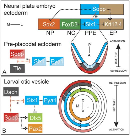 Fig. 7. Model for Sobp interactions during craniofacial development. (A) Sobp expression in two ectodermal domains (PPE and EP) directly or indirectly induces epidermal genes (krt12.4), represses neural plate genes (sox2) and represses the Six1+Eya1 transcriptional activation (asterisk) in the PPE. Sobp effects outside the PPE are likely independent of Six1. Repression of the transcriptional activation of Six1+Eya1 target genes (asterisk) is likely achieved by higher levels of Sobp and lower levels of Six1, and the additional expression of the known Six1 co-repressors (e.g. Groucho/Tle) in the anterior PPE. Conversely, in the posterior PPE, lower levels of Sobp, higher levels of Six1 and lower/no Groucho/Tle expression leads to transcriptional activation. Eya1 is co-expressed with Six1 in this domain. A, anterior; EP, epidermis; L, lateral; M, medial; NP, neural plate; NC, neural crest; P, posterior; PPE, pre-placodal ectoderm. (B) Sobp expression in the medial wall of the otic vesicle is higher in the dorsal region, a domain where Dach co-repressors are also expressed. This expression pattern leads to repression of the transcriptional activation of Six1+Eya1 target genes (asterisk), thus allowing expression of dorsal otic genes (e.g. Dlx5). Ventrally, Sobp induces expression of Pax2 independent of Six1. Six1 and Eya1 have overlapping expression. D, dorsal; L, lateral; M, medial; V, ventral. |
