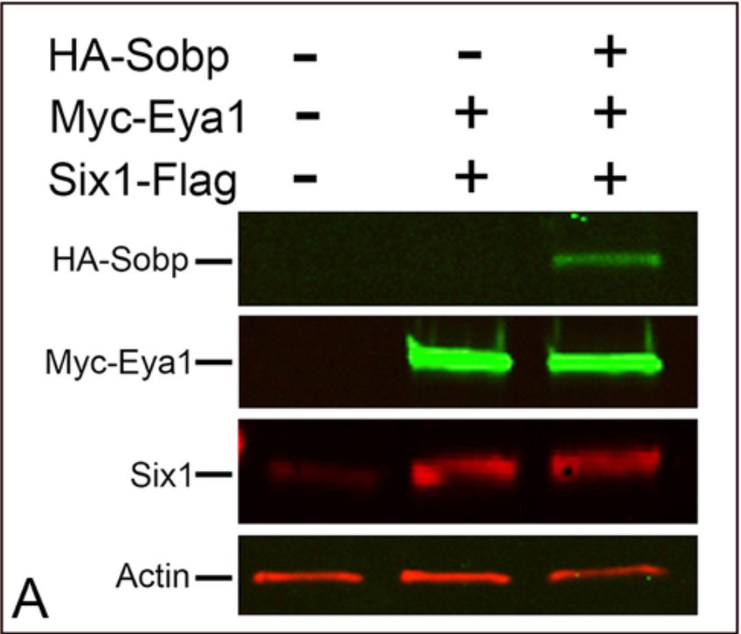 Fig. S2. Control multiplex fluorescence Western blot for luciferase assays. Constructs for HA-Sobp, Myc-Eya1 and Six1-Flag are properly expressed in HEK293T cells in different combinations tested in luciferase assays. Actin is used as loading control. |