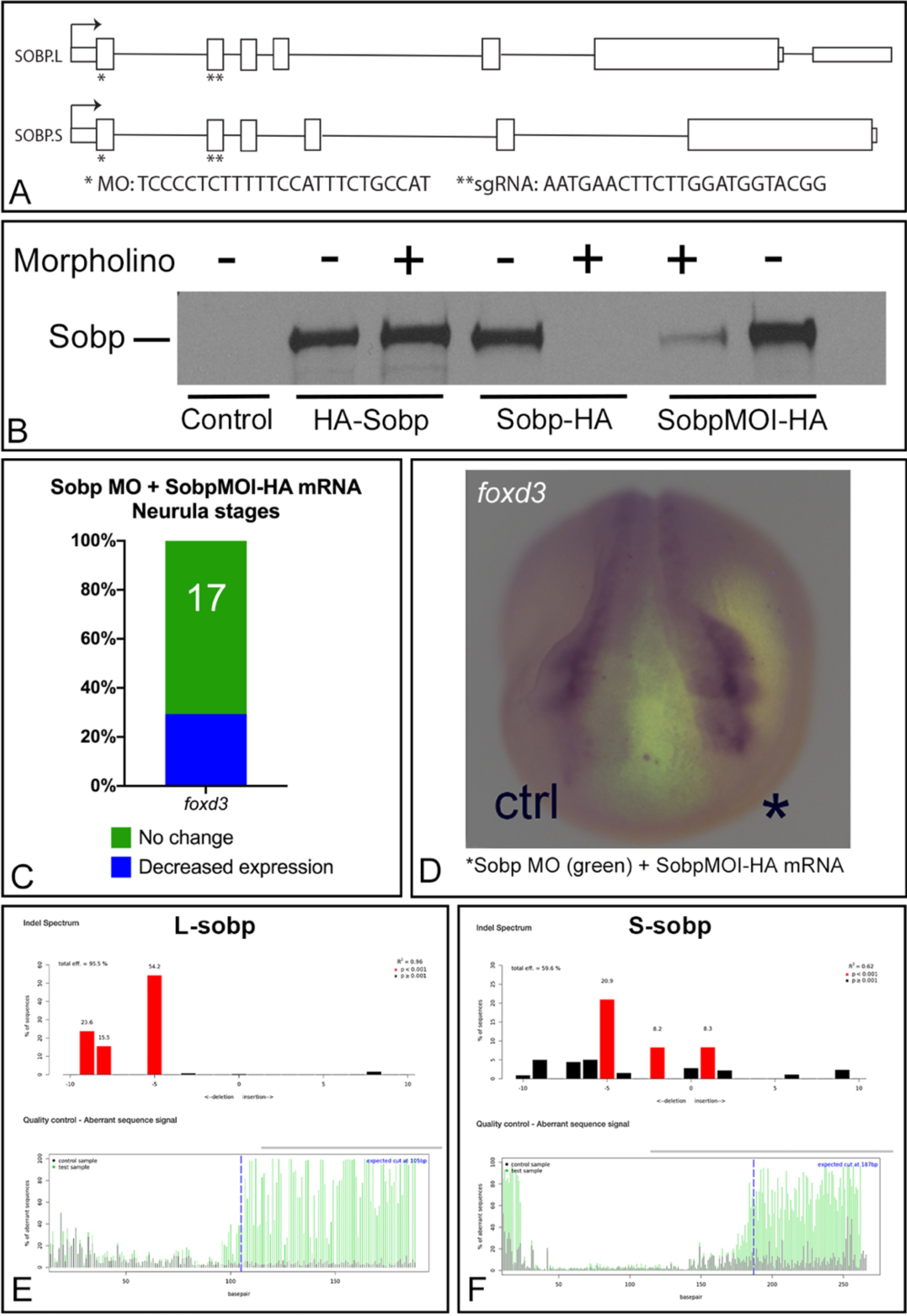 Fig. S3. Control experiments for in vivo studies using a translation-blocking antisense morpholino oligonucleotide (MO) against Sobp or F0 analysis after CRISPR/Cas9-mediated genome editing. A. Schematic representation of exons and introns in Xenopus laevis Sobp.L and Sobp.S genes. The MO binds at the ATG start site for both L- and S-homeologs. The sgRNA targets the L- and S-homeologs in the second exon. B. Western blot detection of the HA tag showing the ability of the MO to block endogenous sobp translation (represented by Sobp-HA). The HA-sobp transcript is expected to avoid translation blockage because the 5âHA tag prevents MO binding at the translational start site. Translation of sobp-HA is expected to be blocked in the presence of the MO because the 3âHA tag does not interfere with MO binding. sobpMOI-HA is translated in the presence of MO because it has a deletion of the third codon in the sobp ORF (and a 3âHA tag) making it insensitive to a translation-blocking MO. C. Graph showing decrease in the frequency of foxd3 reduction (29.4%) after partial rescue with unilateral injection of MO plus sobpMOI-HA mRNA (compare to 90.2% reduction in MO-only embryos). D. An embryo in which foxd3 expression on the MO+sobpMOI-HA side (*) is similar to control side. E-F. Calculation of insertion/deletion frequencies with the TIDE software package in an injected embryo after CRISPR/Cas9 editing showing that sgRNA targets both homeologs at the predicted site. |