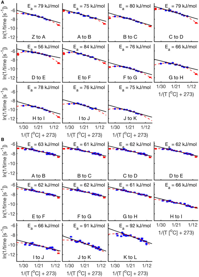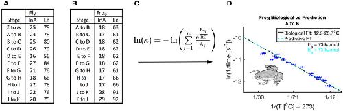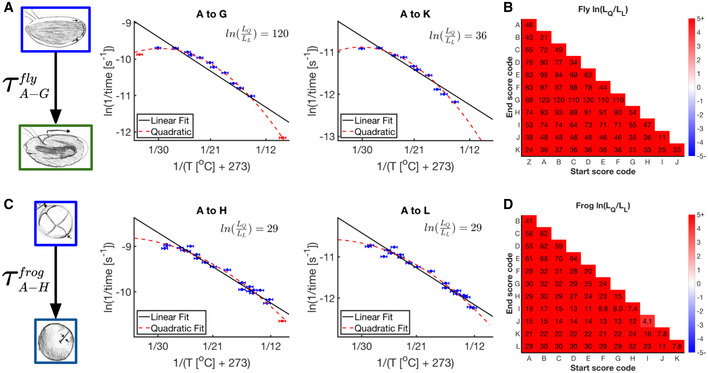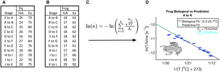 Figure EV4. Parameters for linear fits and sequential linear model prediction capture temperature dependence of entire embryonic development well A table showing fly intervals marked by their start and ending scores and their empirically determined prefactors (lnA) and apparent activation energy (Ea) from Fig EV2A.As (A) but for frog prefactors and apparent activation energy calculated empirically from Fig EV2B.Our predictive equation determined in equation (3) for an assumed sequential linear network.Prediction of ln(k) for the composite network (dashed cyan) is overlaid on the empirical data (blue and red error bars) and linear fit (solid black) for this developmental interval (A to K). Also shown are the color‐coded Eas calculated for each fit over the temperature interval 12.2–25.7°C (n = 100 independent biological measurements). Error bars in temperature represent the standard error (± 0.5°C) of the thermometer used when recording temperature. Error bars in ln(rate) represent standard error (n = 2–10 biological replicates per temperature). |