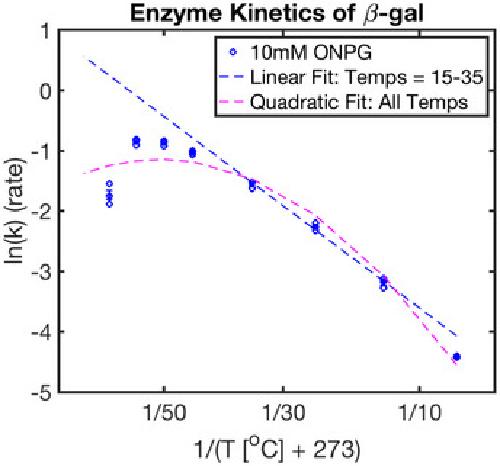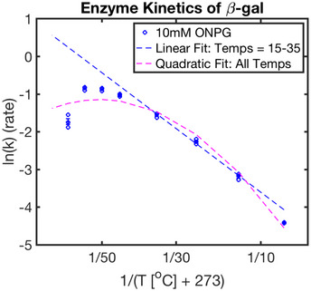 Figure EV5. Assay of β‐galactosidase activity over its viable temperature range under 0‐order kinetic conditionsPlotted here is the Arrhenius plot for this conversion. Replicates (blue circles) are fit with a linear fit (dashed blue line) from 15 to 35°C and a quadratic fit (dashed magenta) over the entire viable temperature range. Standard error is shown as blue error bars (n = 3 technical replicates per temperature). Reaction was run using 0.25 U/ml β‐galactosidase. |