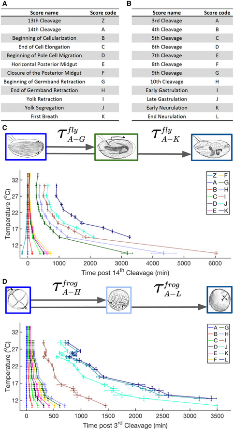 Figure 1. Temperature dependence of development progression in fly and frog embryos A table representing D. melanogaster developmental scoring event names and sequential score codes used throughout this paper.X. laevis developmental scoring and codes used throughout this paper.Shown here is a schematic depicting how time Ï intervals are determined based on beginning and ending scores. Plotted also are all mean time intervals from t = 0, defined as 14th syncytial cleavage, to reach various developmental scores in D. melanogaster embryos. Error bars in time indicate standard deviation among replicates (n = 2â13 biological replicates per temperature). Error bars in temperature represent the standard error (± 0.5°C) of the thermometer used when recording temperature.As (C) but for X. laevis, since t = 0 (3rd cleavage) at temperatures ranging from 10.3°C to 33.1°C (n = 1â23 biological replicates per temperature). |
