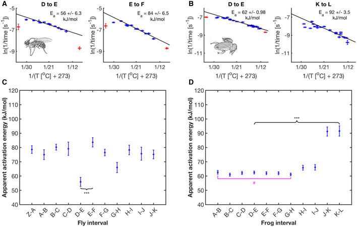 Figure 2. Apparent activation energies vary significantly between developmental intervals Arrhenius plots for two examples of developmental intervals (D–E, E–F) in D. melanogaster. Blue data points are the means of replicates for viable temperatures that survive until First Breath. Red data represent more extreme temperature values where embryos do not survive until First Breath. A linear regression (solid black line, n = 66, 65 independent biological measurements, respectively) was fit over the core temperature range (14.3–27°C), from which Ea was calculated and reported with its 68% confidence interval. Error bars in temperature represent the standard error (± 0.5°C) of the thermometer used when recording temperature. Error bars in ln(rate) represent standard error (n = 3–13 biological replicates).As (A) but for intervals G‐H, K‐L in X. laevis. Blue data points represent viable temperatures where embryos survive until Late Neurulation. A linear regression (solid black line, n = 120, 94 independent biological measurements, respectively) was fit over core temperatures spanning 12.2–25.7°C, from which the Ea was calculated and reported in black. Error bars in temperature represent the standard error (± 0.5°C) of the thermometer used when recording temperature. Error bars in ln(rate) represent standard error (n = 1–10 biological replicates).Apparent activation energies in fly calculated from Arrhenius plots (Fig EV2A). The x‐axis is labeled with the developmental interval, marked by start and endpoint. Error bars represent the 68% confidence interval for the activation energy based on linear fit in the Arrhenius plot. Black braces connect examples of developmental intervals that show statistically significant differences in slope (and thus Ea), with respectable power (> 0.8), ***P < 0.001, (F‐test), (n = 39–60 independent biological measurements).As (C) but for frog Ea calculated from plots shown in Fig EV2B. Magenta brackets represent groupings (all points above the bracket) showing no statistical difference (#) in activation energy (F‐test), (n = 94–135 independent biological measurements). |