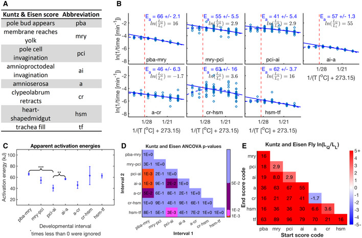 Figure EV3. Reanalysis of temperature dependence data in Drosophila melanogaster development from Kuntz and Eisen Scores Kuntz and Eisen used and abbreviation for the remainder of this figure.Arrhenius plots for durations between adjacent developmental events of Kuntz and Eisen’s data. We fit data for temperatures of 27.5°C and below (dashed red line, i.e., core temperature range) via linear regression (solid blue line). Shown is the apparent activation energy plus/minus the 68% confidence interval. Additionally, we fit the entire temperature range with quadratic (dashed blue line) and linear fits. BIC was also calculated and is shown here as the natural log ratio likelihood for quadratic over linear fit and displayed in black.Apparent activation energies over the core temperature regime are shown. Error bars show the 68% confidence intervals. Black braces point out example developmental intervals that have significantly different apparent activation energies. ‘**’P‐value < 0.01, ‘***’P‐value < 0.001.Shown are P‐values between all developmental intervals. Blue marks P‐values above 5E‐2, purple marks ≤ 5E‐2, pink marks ≤ 1E‐2, and red marks ≤ 1E‐3.Shown are natural log ratio of likelihoods for quadratic over linear fits for all possible developmental intervals, marked by their starting and ending scores, using Kuntz and Eisen’s data over all temperatures. Blue signifies a preference for linearity; red signifies a preference for quadratic behavior. |