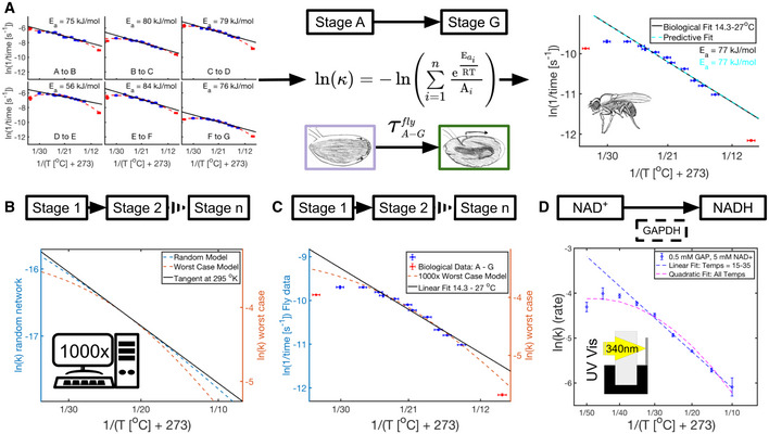 Figure 4. Complexity and nonâidealized behavior of individual enzymes can contribute to nonâidealized behavior of developmental processes Shown is the methodology used to predict the linear regression for fly development from A to G using empirical parameters from individual intervals and equation (3). Far right, this prediction of ln(k) for the composite network (dashed cyan) is overlaid on the empirical data (blue and red error bars) and linear fit (solid black line) for this developmental interval (AâG). Also shown are the colorâcoded Eas calculated for each fit over the temperature interval 14.3â27°C (n = 60 independent biological measurements). Error bars in temperature represent the standard error (± 0.5°C) of the thermometer used when recording temperature. Error bars in ln(rate) represent standard error (n = 2â12 biological replicates).Shown is a schematic of a multiâreaction network from Stage 1 to Stage n. Comparison of two reaction networks modeling equation (3) with 1,000 coupled reactions, one with randomly selected Ea and A (dashed blue line), the second with Ea and A optimized for maximum curvature at 295°K (dashed orange line). To allow direct comparisons, the yâaxes were scaled to result in overlapping tangents calculated at 295°K (solid black line).As (B), however, the worstâcase model (dashed orange) is compared to biological data (blue and red error bars representing standard error in ln(rate), n = 2â12 biological replicates per temperature) from (A). To allow direct comparisons, the yâaxes were scaled to result in overlapping linear fits over 14.3â27°C (solid black line).Shown is a schematic representing the conversion of NAD+ to NADH via GAPDH catalyzation. GAPDHâs conversion of NAD+ to NADH was monitored with UV/VIS spectroscopy at 340 nm. Plotted here is the Arrhenius plot for this conversion at various temperatures between 5°C and 45°C. Means of technical replicates (blue circles) are fit with a linear fit (dashed blue line) from 15 to 35°C and a quadratic fit (dashed magenta) over the entire temperature range. Standard error is shown as blue error bars (n = 2â4 technical replicates per temperature). |