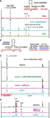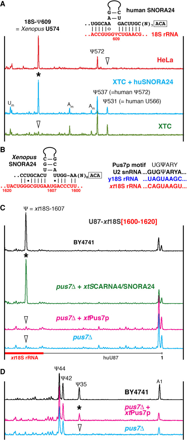 FIGURE 1. Testing SNORA24 modification guide activities. (A) Mapping of pseudouridines in 18S rRNA from human HeLa cells (red trace) and Xenopus laevis XTC cells (green and blue traces) using fluorescent primer extension. Peaks corresponding to reverse transcription termination at modified positions are indicated. Arrowheads point to unmodified positions. Ectopic expression of human SNORA24 in XTC cells induces pseudouridylation of Xenopus 18S rRNA at position 574, equivalent to human 18S-609 (blue trace, star). Postulated base-pairing between human SNORA24 and 18S rRNA shown in the top right corner. (B) Predicted base-pairing between Xenopus SNORA24 and 18S rRNA (left) and Pus7p recognition motif (right). (C) Modification of the artificial substrate RNA specific for xtSNORA24 (U87-xt18S[1600–1620]) in wild type BY4741and pus7Δ mutant yeast strains. The position corresponding to xt18S-1607 in the artificial substrate RNA is pseudouridylated in wild type (black trace) and in the pus7Δ strain that expresses xtSNORA24 (green trace, star). This position is not modified in the pus7Δ strain itself (blue trace, arrowhead) and in the pus7Δ strain that expresses Xenopus Pus7p (pink trace, arrowhead). Note, that in a fragment of 18S rRNA [1600–1620], yeast Pus7p recognizes a sequence different from the consensus UGΨAR (Urban et al. 2009; Carlile et al. 2014; Schwartz et al. 2014): It contains A instead of unvarying U at −2 position, AGΨAA (B). (D) Pseudouridylation of yeast U2 snRNA in wild type (black trace) and mutant pus7Δ strains (blue and pink traces). Expression of Xenopus Pus7p in the pus7Δ yeast strain rescues pseudouridylation of U2 snRNA at position 35 (pink trace, star).