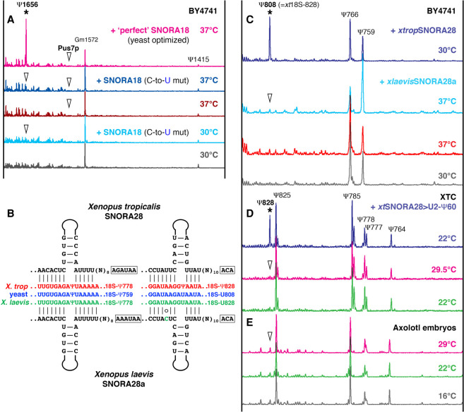 FIGURE 3. 18S rRNA modification under normal and high temperature conditions in yeast (A,C) and amphibian cells (D,E). (A) Yeast optimized SNORA18 (C-to-U mutant, depicted in Fig. 2A) does not induce pseudouridylation of yeast 18S rRNA at position 1656 (equivalent to human 18S-1720) in the BY4741 strain grown at 30°C, nor can it do so at 37°C (blue traces). “Perfect” SNORA18, a “perfect guide” RNA for position 1656 in yeast 18S rRNA made from SNORA18 (depicted in Fig. 2A), induces pseudouridylation of the target position both at 30°C (not shown) and 37°C (top pink trace, star). Note there is no Pus7p activity on position 1585 in 18S rRNA both at 30°C and 37°C. Positions that were expected to be modified are indicated with arrowheads. (B) Postulated base-pairing of X. tropicalis and X. laevis SNORA28 with 18S rRNA. For the 5′-terminal (left schematic) and the 3′-terminal pseudouridylation pockets (right schematic), target positions and corresponding modifications are indicated on the right side of each pocket. A mismatched nucleotide in the 3′-terminal X. laevis ASE is highlighted in green. (C) Yeast cells grown at 37°C do not induce pseudouridylation activity of X. laevis SNORA28 on yeast 18S rRNA at position 808 (equivalent to Xenopus 18S-828). Note the increased modification level at position 759, the other target of SNORA28 (light blue trace), as compared to controls (gray and red traces). X. tropicalis SNORA28 is functional on position 808 (top dark blue trace, star). (D,E) X. laevis XTC cells (D) and axolotl embryos (E) grown at elevated temperatures do not have altered pseudouridylation patterns of 18S rRNA. (D) When snoRNA with a functional pseudouridylation pocket for 18S-828 (xtSNORA28 > U2-Ψ60, blue trace) is expressed in XTC cells, this position is modified (star). Unmodified position 828 is indicated with arrowheads.