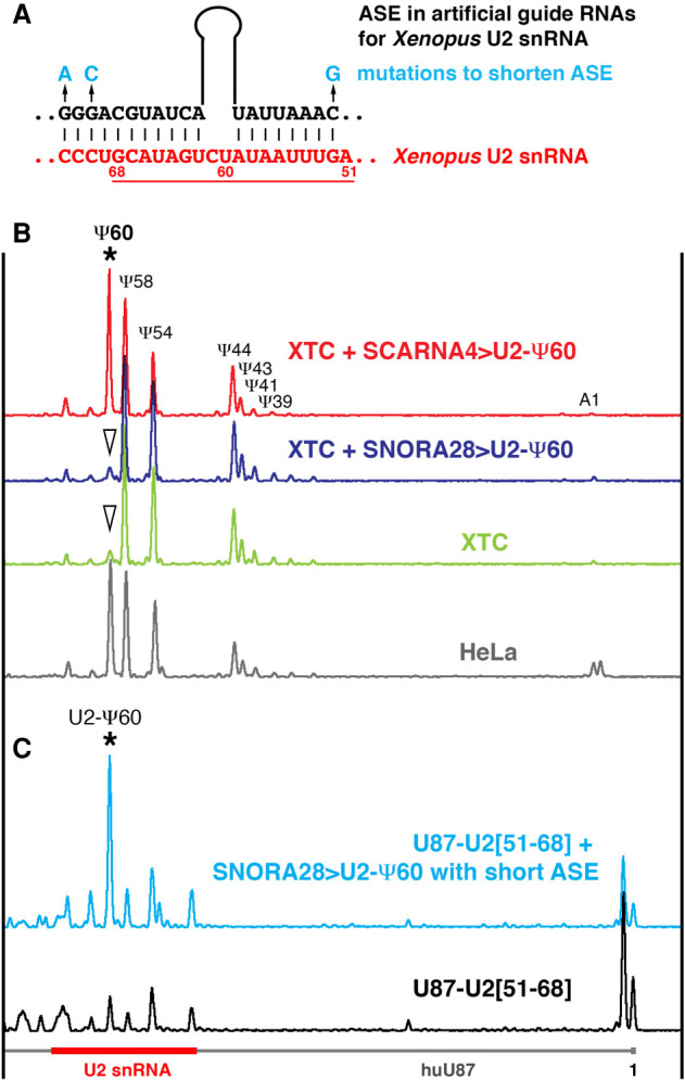 FIGURE 5. (A) A pseudouridylation pocket generated in xtSCARNA4 and SNORA28 to make artificial guide RNAs for Xenopus U2 snRNA modification at position 60 (SCARNA4 > U2-Ψ60 and xtSNORA28 > U2-Ψ60). Mutations that shorten the ASE are indicated in blue; a fragment of U2 snRNA inserted in a U87-based artificial substrate RNA is underlined. (B) Mapping pseudouridines in human and Xenopus U2 snRNA. Normally, human U2 snRNA (HeLa, gray trace) is pseudouridylated at position 60; Xenopus U2 snRNA is not modified at this position (XTC, green trace). Expression of SCARNA4 > U2-Ψ60 (red trace, star) but not xtSNORA28>U2-Ψ60 (dark blue trace, arrowhead) induced U2 snRNA pseudouridylation at position 60 in the Xenopus laevis cell line XTC. (C) Pseudouridylation of the artificial substrate RNA containing a fragment of vertebrate U2 snRNA (U87-U2[51–68]) in yeast cells. Even with a short ASE, xtSNORA28 > U2-Ψ60 is functional on U2 snRNA artificial substrate (blue trace, star).