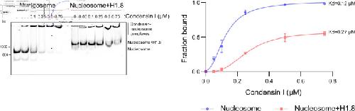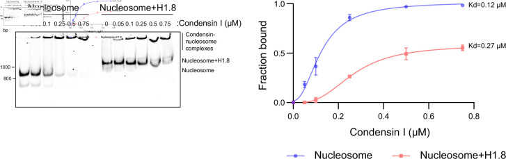 Figure 2—figure supplement 4. H1.8 inhibits condensin binding to mononucleosomes.Alexa647-labeled 196 bp mononucleosomes with or without H1.8 were incubated with indicated concentrations of condensin I and electrophoresed on a 5% native PAGE. Alexa647-labeled DNAs are shown. Condensin I binding curves with mononucleosomes with and without H1.8, showing the large increase in binding constant in the presence of H1.8. The data plotted is the mean and SEM of three independent experiments The binding constants derived from fitting the aggregate data to a sigmoidal binding curve are shown (Figure 2—source data 1). |