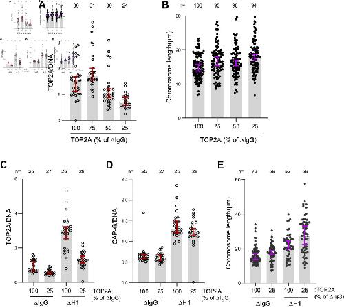 Figure 3âfigure supplement 2. TOP2A overloading is not responsible for chromosome elongation.(A) Sperm nuclei were replicated in undepleted interphase extracts supplemented with 25 nM Cy3-dUTP. The nuclei were then cycled back by mixing with different ratios of ÎTOP2A extracts. Immunofluorescence data showing chromatin-bound TOP2A normalized to Cy3-dUTP signal in each condition. Each dot represents the normalized mean intensity of a single nucleus. (B) Chromosome lengths in the indicated conditions. Each dot represents the length of a single chromosome. (C) Sperm nuclei were replicated in either mock (ÎIgG) and H1.8-depleted (ÎH1) extracts and cycled back using 3 volumes of the corresponding extracts (ÎIgG/ÎH1) or 3 volumes of ÎIgGÎTOP2A/ÎH1ÎTOP2A extracts correspondingly. Immunofluorescence data showing the chromatin-bound TOP2A in the indicated conditions. Each dot represents the normalized mean intensity of a single nucleus. (D) Immunofluorescence data showing chromatin-bound CAP-G (condensin I) and chromosome lengths in the indicated conditions. Each dot represents one nucleus (D) or one chromosome (E). Data plotted for all plots are medians and corresponding 95% CI. The number of nuclei or chromosomes is indicated above the plots. |
