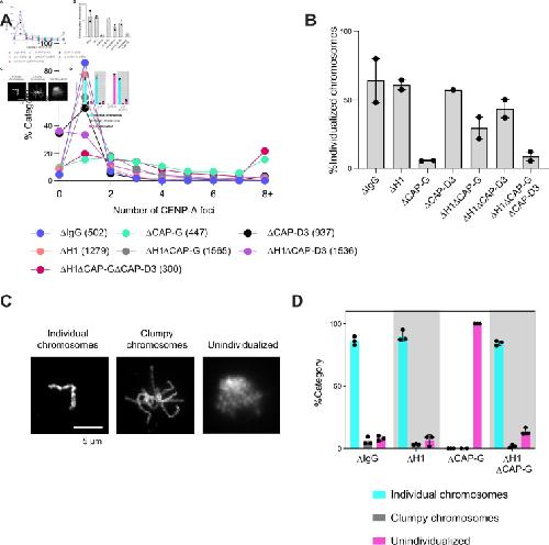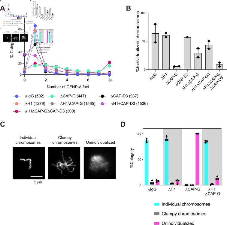 Figure 6—figure supplement 1. Additional data for chromosome clustering.(A) Distribution of CENP-A foci per DNA mass in the experiment shown in Figure 6A–C. Clusters of unresolved chromosomes are represented by higher numbers (>3) of CENP-A foci per DNA mass indicates clusters. No detectable CENP-A focus in ∆CAP-D3 (∆condensin II) extracts is due to low CENP-A signal, reflecting the reported role of condensin II in CENP-A loading (Bernad et al., 2011). The number noted in each sample label is the number of chromosomes/clusters counted in each condition. (B) Percent frequency of single chromosomes (chromosomes in DNA masses with <2 CENP-A foci) in the indicated conditions showing that the cutoff for number of CENP-A foci does not change the relative individualization measured. The number of DNA masses imaged in each condition is the same as in Figure 6C. (C) Categories of chromosome clusters observed upon performing chromosome individualization assay. (D) Percent frequency of DNA clusters categorized as unindividualized nuclei as in (C) in the indicated conditions. Each chromosome mass is classified to one of the three categories based on the morphology. ‘Clumpy chromosomes’ represents a mass containing a few clearly recognizable chromosomes, while ‘unindividualized’ represents a mass with unresolved multiple chromosomes. Mean and SEM from three independent experiments. Each dot represents the percentage of unindividualized chromosome clusters in the indicated condition in an independent biological replicate. The number of DNA masses counted in each condition is as follows: ΔIgG (50, 128, 201), ΔH1 (66, 135, 447), ΔCAP-G (13, 30, 50), ΔH1ΔCAP-G (58, 201, 194). |
