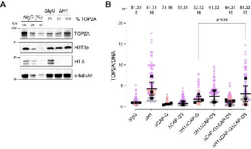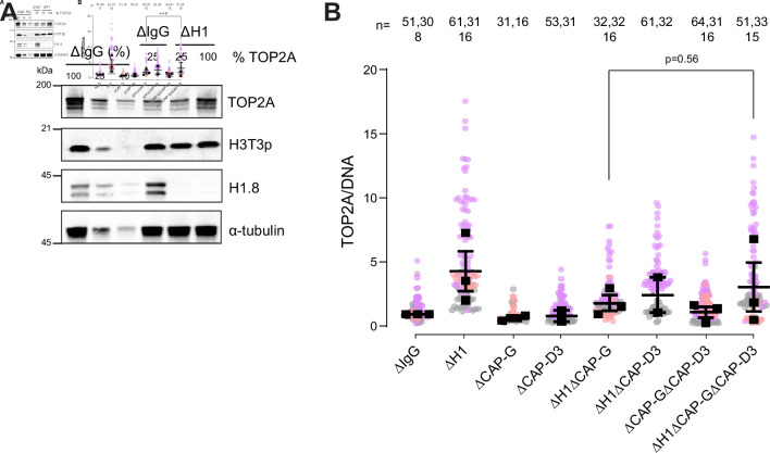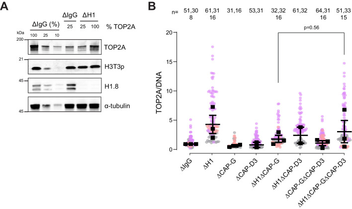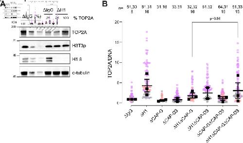 Figure 7—figure supplement 1. H1.8 suppresses over-individualization through condensins and topo II.(A) Western blots of total egg extracts showing partial depletion of TOP2A. Left three lanes: dilution series of total mock-depleted extracts (∆IgG) for signal quantitation. Middle ∆IgG lane: extracts with 25% level of TOP2A. right two ∆H1 lanes; extracts depleted of H1.8 with either 25 or 100% levels of TOP2A. (B) Quantification of TOP2A signal normalized to the DNA signal in the indicated conditions. Each gray, orange, or violet dot represents the mean normalized TOP2A level in a single nucleus. The black squares represent the median of the TOP2A values of all the nuclei in a single experiment. Data plotted is mean and SEM. The p-value in (C) was calculated using an unpaired Student’s t-test. The number of nuclei imaged in (C) in each condition is indicated above the figure, and the data for this figure is submitted as Figure 7—source data 1. |