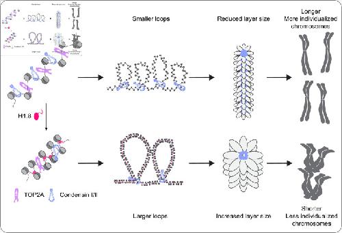Figure 8. A graphical model of how H1.8 controls mitotic chromosome length.In the absence of H1.8, more condensins and topo II bind to more DNA loops of shorter length, resulting in longer and more individualized chromosomes (top). H1.8 limits chromatin levels of condensins and topo II to generate longer and thus fewer DNA loops, resulting in shorter and less individualized chromosomes (bottom). |