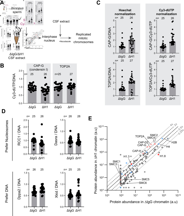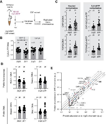 Figure 1—figure supplement 1. H1.8 depletion does not lead to global accumulation of DNA-binding proteins.(A) Experimental scheme to incorporate Cy3-labeled nucleotides to use normalization of immunofluorescence signals on chromosomes. (B) Quantification of Cy3-dUTP signals normalized to Hoechst 33342 signals, showing uniform normalization across two coverslips used for quantification of condensin I and TOP2A. The result also indicates no detectable defect in DNA replication in ∆H1 extracts. (C) CAP-G (condensin I) and TOP2A immunofluorescence signal levels on chromosomes normalized with Hoechst and incorporated Cy3-dUTP. Normalization using Hoechst 33342 and Cy3-dUTP/Cy5-dUTP signals was shown to be consistent across many experiments. (D) Quantification of immunofluorescence signal levels of two proteins that prefer nucleosomes (RCC1 and Dasra A) and two that prefer to bind nucleosome-free DNA (Dppa2 and Xkid) (Zierhut et al., 2014). In (B–D), distribution of signal intensity per chromosome cluster (dots), and median and SEM from one experiment are shown. This analysis was performed twice, and the similar results were obtained. (E) Protein abundance on metaphase sperm chromosomes purified from mock and H1.8-depleted extracts. Subunits from the structural maintenance of chromosomes (SMC) family complexes are labeled in pink. Core histones and their variants are in blue and linker histone variants are shown in red. The lines for 0.25×, 0.5×, 1, 2×, and 4× abundance on ΔH1 compared to ΔIgG chromosomes are shown. The mass spectrometry analysis was performed once. The number of nuclei imaged in each condition for each experiment in (B–D) is indicated above the figure. |
