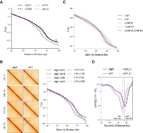 Figure 4. Effects of H1 and/or condensin I and II depletion on mitotic genome folding.(A) Hi-C maps of metaphase X. laevis chromosome 3S, binned to 250 kb, in the indicated condition. (B) Genome-wide average contact probability decay curves for the indicated conditions showing the changes in longer distance interactions. (C) Derivative plots of the average contact probability decay curves for dispersed chromosomes from mock (ΔIgG) and H1.8-depleted extracts (ΔH1) showing the change in estimated loop size. The solid and dotted lines are from two independent biological replicates. (D) Derivative plots of the genome-wide average contact probability decay curves in the indicated conditions. The dotted lines indicate the layer sizes for each plotted condition. (E) Estimates of layer size from derivatives of genome-wide probability decay curves upon depletion of H1.8 and CAP-G (condensin I) or CAP-D3 (condensin II). The mean and range of two biological replicates are shown. Figure 4—source data 1. Source data for all the figures in Figure 4 and its figure supplements.Figure 4—figure supplement 1. Effects of H1, condensin I, and condensin II depletion on mitotic genome folding.(A) Contact probability decay curves of mitotic chromosomes in mock (ΔIgG) and H1-depleted (ΔH1) extracts from two different experiments showing the replicability of the Hi-C features. The solid and dashed lines are from biological replicates. (B) Hi-C maps (left) binned to 500 kb and contact probability curves (right) of single chromosomes showing the uniform effects of H1.8 depletion genome wide. (C) Genome average contact probability decay curves upon H1.8, CAP-G, and CAP-D3 depletions. (D) Genome average contact probability derivative curves of metaphase chromosomes in undiluted mock (ΔIgG) and H1.8-depleted (ΔH1) extracts. The layer size estimates from the valley in the derivative plots are indicated. The dotted lines are a biological replicate. The data for this figure is submitted as Figure 4—source data 1. |