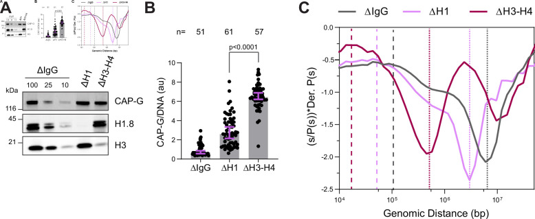 Figure 4âfigure supplement 2. H3-H4 depletion leads to even smaller loop sizes.(A) Western blotting showing the depletion of H3-H4 in total egg extract using the H4K12ac antibody (Zierhut et al., 2014). (B) Quantification of condensin I (CAP-G) immunofluorescence levels on chromosomes normalized to DNA in âH1 and âH3-H4 extracts. Each dot represents the average signal intensity of a single chromosome cluster (from one nucleus). Data plotted is median and 95% CI > 40 nuclei were quantified for each condition plotted. The statistical significance between ÎH1 and ÎH3-H4 was analyzed by a two-tailed MannâWhitney U-test. (C) Hi-C probability decay derivative plots estimating the loop sizes in âH1 and âH3-H4 extracts. The dashed lines indicate the loop sizes in the corresponding conditions and the dotted lines indicate the layer size. Two biological replicates for Hi-C on chromosomes from ÎH3-H4 extracts were performed and similar results were obtained from both experiments. The data for this figure is submitted as Figure 4âsource data 1, and the number of nuclei imaged in (B) is indicated above the figure. |