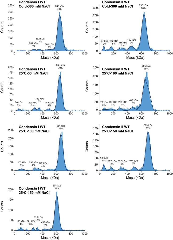Figure 2—figure supplement 1. Mass photometry of condensin complexes.Recombinant condensin complexes were diluted to 50 nM in buffer (10 mM HEPES pH 8, 2.5 mM MgCl2, 1 mM DTT, 5 mM ATP) supplemented with the indicated sodium chloride concentration and the indicated temperatures for 30 min subjected to mass photometry to determine whether the complexes remain intact in the buffer conditions used for the binding assays. Histograms of the particle count at the indicated molecular mass. The molecular mass was calibrated using bovine serum albumin and urease. The black lines are the Gaussian fits to the peaks. The peak of the Gaussian fit and the percentage of particles in the peak are indicated above each peak. Theoretical molecular weights of condensin I and condensin II complexes are 638 kDa and 658 kDa, respectively. |