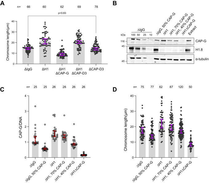 Figure 3—figure supplement 1. Condensin I loading determines chromosome length.(A) Length of mitotic chromosomes in the indicated conditions after extract dilution showing no effect of CAP-D3 (condensin II) depletion in both mock and H1.8 depletion background. Each dot represents length of a single chromosome. Bars represent median ± 95% CI. The length of >50 chromosomes was measured in each condition for every experiment. (B) Total egg extract blots showing the partial depletions of condensin in the indicated conditions. The p-value in (A) was calculated by a two-tailed Mann–Whitney U-test. The number of chromosomes imaged in each condition for each experiment in (A) is indicated above the figure (Figure 3—source data 1). (C, D) Biological replicate of the partial condensin I depletion experiment in Figure 3E and F. |