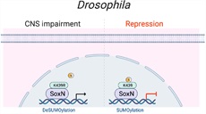 Figure 3. SUMOylation of SoxN on lysine 439 (K439) suppresses transcriptional activity, which prevents CNS from impairment in Drosophila.CNS: Central nervous system; Sox: SRY-related HMG-box; SUMO: small ubiquitin-like modifier. Created with BioRender.com.