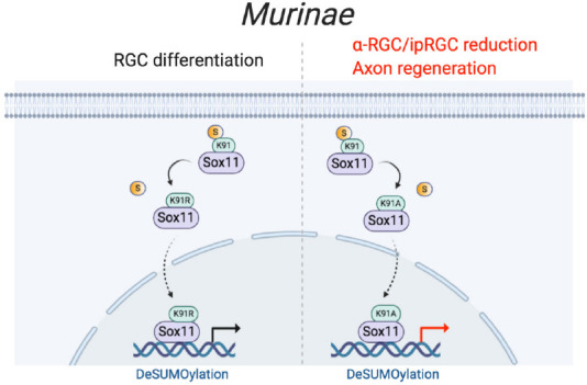 Figure 1. DeSUMOylation of Sox11 by lysine 91 (K91) mutation promotes RGC differentiation and axon regeneration but reduces α-RGC and ipRGC expression in Murinae.ipRGC: Intrinsically photosensitive retinal ganglion cell; Sox: SRY-related HMG-box; SUMO: small ubiquitin-like modifier. Created with BioRender.com.
