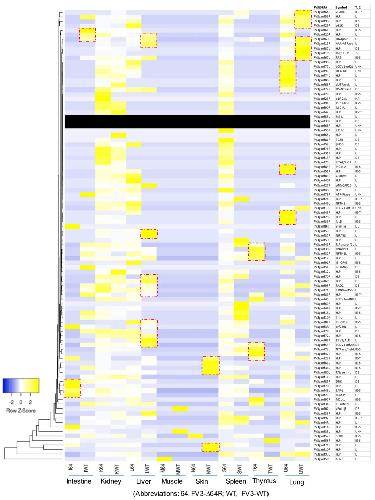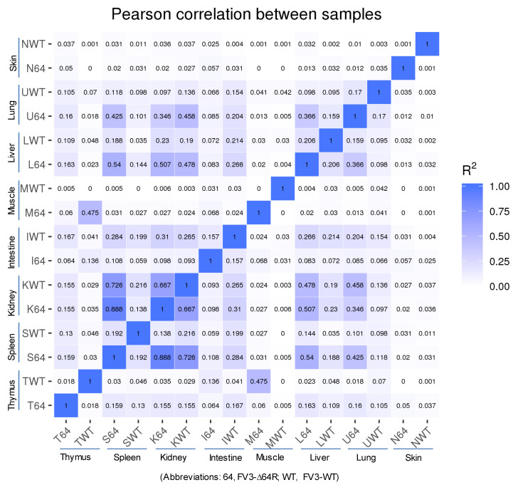 Figure 3. RNA-Seq correlation among the samples. Heat maps of the correlation coefficient between samples are shown. Numbers indicate the square of the Pearson coefficient (R2). The closer the correlation coefficient was to 1, the greater the similarity of the samples. Generally low R2 values indicated a dramatic difference between different tissues and two FV3 strains. |