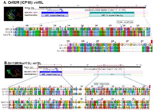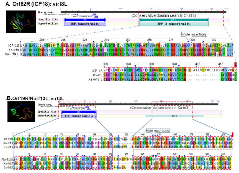 Figure 8. Identification of putative interferon regulatory factor domain (IRF) in FV3 hypothetical proteins, which are potentially virus-coding molecular mimics able to interfere with the host antiviral interferon signaling. (A) Orf82R refers to FV3orf82R spanning 89,450–89,923 nt region on the positive strand of the FV3 genome (NC_005946.1), and encodes a hypothetical protein ICP-18 of 157 AA. It contains the second IRF-like domains at ~30% AA sequence similarity to the second IRF domain detected at Xenopus IRF8 proteins, as illustrated. (B) Orf19R refers to FV3orf19R spanning the 21,916–24,471 nt region on the positive strand of the FV3 genome and encodes a hypothetical protein of 851 AA. It contains two IRF domains (partially second one) at its C-terminal ~500 AA. Norf13L ascribes a novel open reading frame (Norf) predicted using the FGEESV0 program, which spans the 14,685–15,092 nt region of the negative strand of the FV3 genome and encodes a hypothetical protein of 135 AA. It contains two nearly consecutive IRF domains (partially a second one) as aligned to irf3 homologs. The full-length sequences of the predicted hypothetical ORF/proteins are provided in File S1. The collective information of other IRF-like domain-containing proteins and GenBank accession numbers of the aligned protein sequences are listed in Table 1. Putative protein domains were queried and extracted using the NCBI CDD database, and their tertiary structure was modeled using Phyre2 and PyMol programs. Multiple sequence alignments were obtained using a Jalview program. |