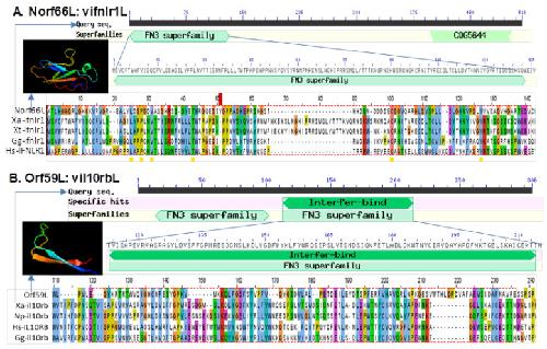 Figure 9. Detection of fibronectin type 3 domain (FN3) conserved in the IFN receptors of several FV3 hypothetical proteins, which are potential virus-coding molecular mimics able to interfere with the host antiviral interferon signaling. (A) Norf66L ascribes a novel open reading frame (Norf), which spans the 59,162–60,037 nt region of the negative strand of the FV3 reference genome and encodes a hypothetical protein of 291 AA. It contains an FN3 domain (residue 121–230 AA) similar to vertebrate interferon lambda receptor 1 (ifnlr1) isoforms regarding the sequence similarity and β-sheet containing structure. (B) Orf59L refers to FV3orf59L spanning the 65,956–67,014 nt region on the negative strand of the FV3 genome and encodes a hypothetical protein of 352 AA. It contains an FN3 domain region at 108–203 AA and is molecularly similar to that of Xenopus IL-10 receptor beta unit (il10rb). The full-length sequences of the predicted hypothetical ORF/proteins are provided in File S1. The collective information of other IFN-interfering, domain-containing proteins and GenBank accession numbers of the aligned protein sequences are listed in Table 1. The protein domain analyses were queried and extracted using the NCBI CDD database, the tertiary structures were simulated using Phyre2 and PyMol programs, and sequence alignments and view were simulated with a Jalview program. |