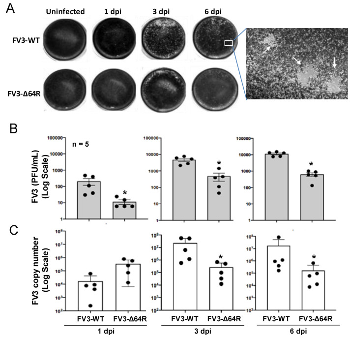 Figure 1. Viral plaque assays and genome copy number detection by quantitative PCR (QPCR). (A) For plaque assays, 1 mL of the virus-containing supernatant of tissue homogenate from an individual kidney sample was used to inoculate A6 cells (ATCC® CCL-102™). FV3 plaques were counted at 1, 3, and 6 days post-infection (dpi) and imaged for representative wells. (B) Virus titers were calculated to present as PFU/mL average for each group/treatment. (C) Virus genome copies were examined in the DNA samples from the infected kidneys using a routine QPCR procedure to determine the FV3gorf60R gene copies in 150 ng DNA per reaction as described. * p < 0.05, n = 5 for (B,C). |