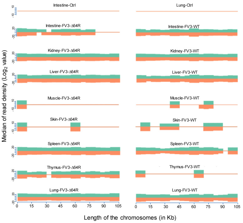Figure 2. Virus-targeted transcriptome analysis in the control and infected samples at 3 dpi. Shown is the distribution plots of mapped reads in the FV3 genome (GenBank accession no. NC_005946.1). The x-axis shows the length of the genome (in Kb, 105 Kb of FV3), and the y-axis indicates the log2 of the median of the read density. Green and red indicate the positive and negative strands, respectively. Note, no FV3 transcript reads were obtained from the control (Ctrl) non-infected samples (shown only from the intestine and lung). |