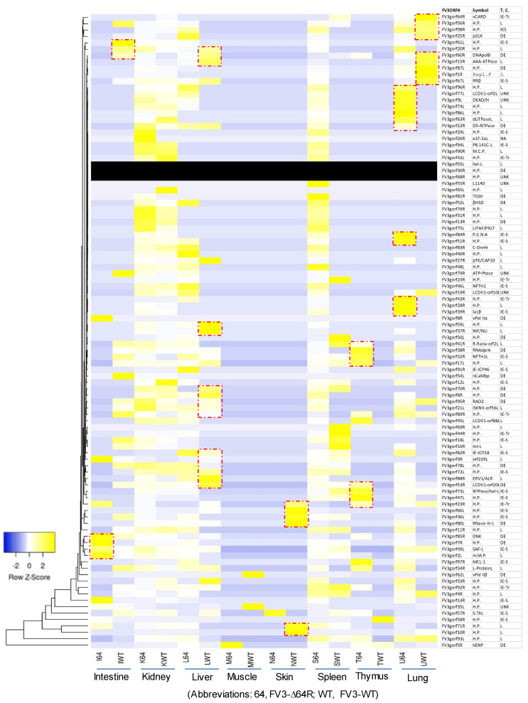 Figure 4. Heatmap and cluster analysis of differential expression of all validated/putative ORFs for coding genes along the FV3 genome. FPKM values were used as for paired-end RNA-Seq per differential gene expression and cluster analysis, clustered using the log10(FPKM + 1) values. Yellow denotes genes with high expression levels, and blue denotes genes with low expression levels. The color range from yellow to blue represents the log10(FPKM + 1) value from large to small. The ORFs sit in the same or close clusters that have similar expression patterns across the samples. The black rows indicate that the expression of the corresponding ORFs has not been detected, implying a silent or nonproductive transcription. The table at the right lists the 98 annotated open reading frames (ORFs) in the FV3 genome and the corresponding designation of gene symbols as defined under the GenBank FV3 reference genome (NC_005946.1). The red line frames indicate higher expressed gene clusters in the infected tissues other than the kidney and spleen, where FV3 primarily showed high expression in general. Other abbreviations: FPKM, fragments per kilobase of transcript per million mapped reads; H.P., hypothetical proteins; T.C., temporal class. |