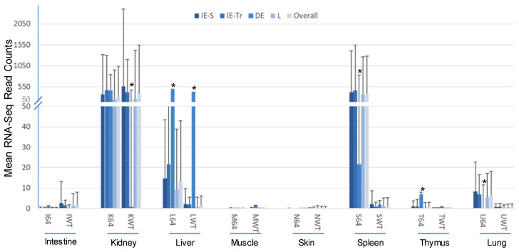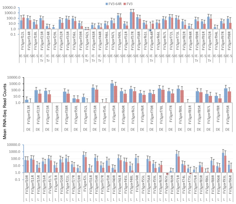 Figure 6. Differential expression of individual genes of FV3 between the FV3-∆64R and FV3-WT infected groups. The genes are categorized based on their sequential classes as immediate early (IE), delayed early (DE), and late (L) viral transcripts. RNA-Seq reads are presented as averages across the eight types of different tissues (i.e., intestine, kidney, liver, muscle, skin, spleen, thymus, and lung) to demonstrate that the differential expression is dependent on the gene and virus strain. Note that the y-axis is in a log10 scale. Other abbreviations: 64, FV3-∆64R; IE-S, immediate early stable messages; IE-Tr, immediate early transient messages; WT, FV3-WT. |