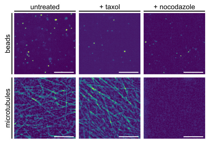 Figure 7. Representative fluorescence images of beads (upper panel) and microtubules (lower panel) in native and pharmaceutically treated Xenopus extracts (see Materials and Methods for details); scale bars indicate 10 μm. While native extracts feature a significant amount of microtubule filaments (left column), the addition of nocodazole completely eradicates these higher-order structures (right column). In contrast, stabilizing microtubules by taxol further enhances the ‘filament jungle’ (middle column).