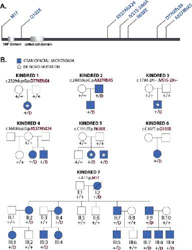 Fig. 1. SF3B2 variants in pedigrees with craniofacial microsomia.A` Domain structure of SF3B2 with variants identified noted above. Domain annotation based on UniProt accession Q13435. B Pedigrees of kindreds with SF3B2 LOF variants. De novo or transmitted LOF variants are indicated above each pedigree, with stars denoting confirmed de novo variants. ‘+’ represents a wild type allele, and ‘D’ represents the LOF variant in SF3B2 indicated above the pedigree. Individuals with no genotype listed represent those in whom genomic DNA was not available for study.
