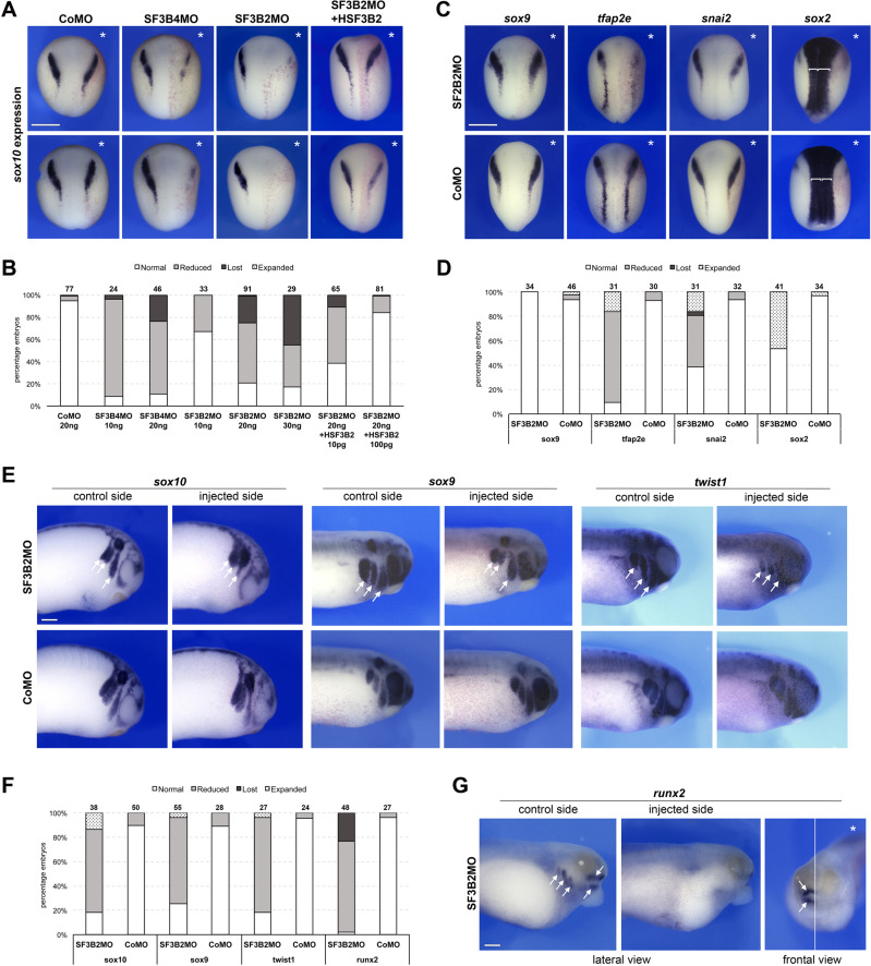 Fig. 3. Sf3b2 knockdown alters neural crest development in Xenopus embryos.A Unilateral injection of increasing doses of SF3B2MO (10-30 ng) interferes with sox10 expression at the neurula stage, in a manner similar to SF3B4 knockdown. Injection of a control MO (CoMO) did not significantly affect sox10 expression. The SF3B2 knockdown phenotype is efficiently rescued by injection of human SF3B2 (HSF3B2; 10 pg or 100 pg) plasmid DNA. mRNA encoding the lineage tracer ß -galactosidase was co-injected with the MOs to identify the injected side (punctate red staining). The injected side is indicated by an asterisk. Dorsal view, anterior to top. The two rows show examples of the phenotype for each injection condition. Scale bar, 500 μm. B Quantification of the phenotypes. The numbers on the top of each bar indicate the number of embryos analyzed from seven independent experiments. C Unilateral injection of SF3B2MO (20 ng) reduces the expression of other neural crest genes at the neurula stage including tfap2e and snai2, and expanded the neural plate expression domain of sox2 (white brackets) on the injected side. sox9 was not affected in these embryos. The injected side is indicated by an asterisk. Dorsal view, anterior to top. Scale bar, 500 μm. D Quantification of the phenotypes. The numbers on the top of each bar indicate the number of embryos analyzed from three independent experiments. E At the tailbud stage, SF3B2MO (20 ng) injected embryos show a decrease in the length of the NC streams (arrows) as visualized by sox10 (stage 25), sox9, and twist1 (stage 28) expression. CoMO injection did not affect NC streams formation. Lateral view, dorsal to top, anterior to right. Scale bar, 250 μm. F Quantification of the phenotypes. The numbers on the top of each bar indicate the number of embryos analyzed from three independent experiments. G At stage 40, the expression of runx2 in the pharyngeal arches mesenchyme (arrows) is severely downregulated in SF3B2MO-injected tadpoles. The white line indicates the midline (frontal view). Scale bar, 250 μm. The quantification of the runx2 phenotype is shown in panel F. Source data are provided as a source data file.