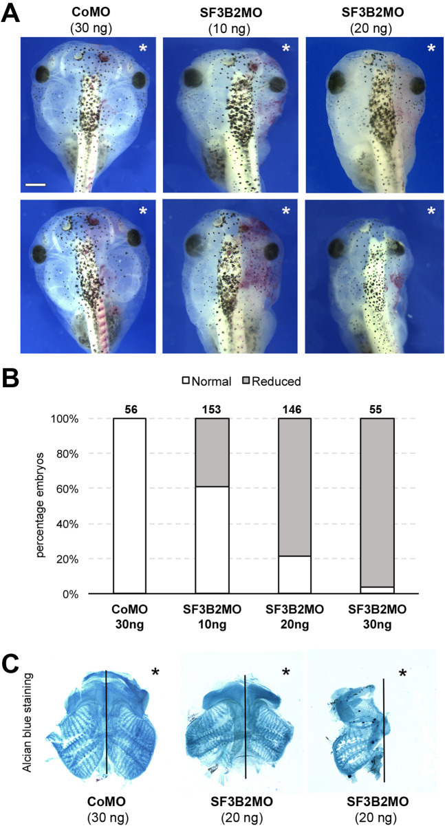 Fig. 4. Sf3b2 knockdown causes craniofacial defects in Xenopus tadpoles.A Gross morphology of the head of SF3B2MO- and CoMO-injected Xenopus tadpoles. The lineage tracer ß -galactosidase was again co-injected, with the injected side indicted by an asterisk. Dorsal views, anterior to top. The two rows show examples of the phenotype for each injection condition. Scale bar, 600 μm. B The graph is a quantification of the results from three independent experiments. The number of tadpoles analyzed is indicated on the top of each bar. C Alcian blue staining of dissected craniofacial cartilages of CoMO (30 ng) and SF3B2MO (20 ng) injected tadpoles at stage 45. The injected side is indicated by an asterisk. The black lines indicate the midline. Source data are provided as a source data file.