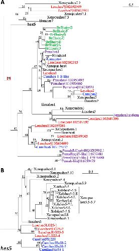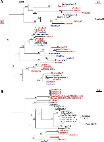 Fig. 3. Phylogenetic analysis of teleost hes genes. The phylogenetic tree was constructed by ML method. hes genes except for hes5 (A), only hes5 genes (B). Red and blue letters indicate zebrafish/medaka and human hes genes, respectively. Hosa, human; Xela, Xenopus laevis; Xetr, Xenopus tropicalis; Dare, zebrafish; Orla, medaka