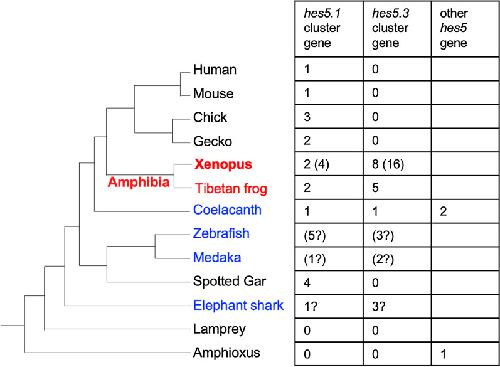 CONCLUSION: These data suggest that the hes5 cluster existed in the gnathostome ancestor but became a single gene in mammals. The number of hes5 cluster genes were specifically large in frogs.