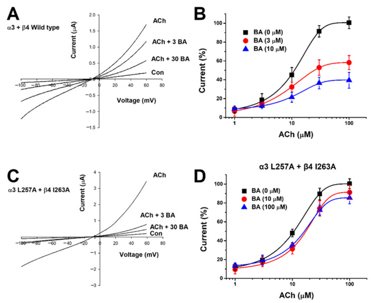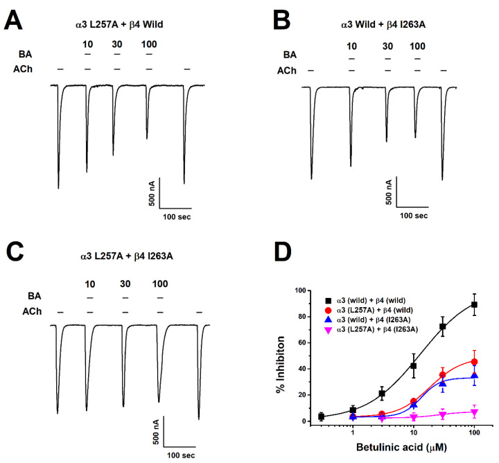 Betulinic acid (BA) is a major constituent of Zizyphus seeds that have been long used as therapeutic agents for sleep-related issues in Asia. BA is a pentacyclic triterpenoid. It also possesses various anti-cancer and anti-inflammatory effects. Current commercially available sleep aids typically use GABAergic regulation, for which many studies are being actively conducted. However, few studies have focused on acetylcholine receptors that regulate wakefulness. In this study, we utilized BA as an antagonist of α3β4 nicotinic acetylcholine receptors (α3β4 nAChRs) known to regulate rapid-eye-movement (REM) sleep and wakefulness. Effects of BA on α3β4 nAChRs were concentration-dependent, reversible, voltage-independent, and non-competitive. Site-directed mutagenesis and molecular-docking studies confirmed the binding of BA at the molecular level and showed that the α3 subunit L257 and the β4 subunit I263 residues affected BA binding. These data demonstrate that BA can bind to a binding site different from the site for the receptor's ligand, acetylcholine (ACh). This suggests that BA may be an effective antagonist that is unaffected by large amounts of ACh released during wakefulness and REM sleep. Based on the above experimental results, BA is likely to be a therapeutically useful sleep aid and sedative.