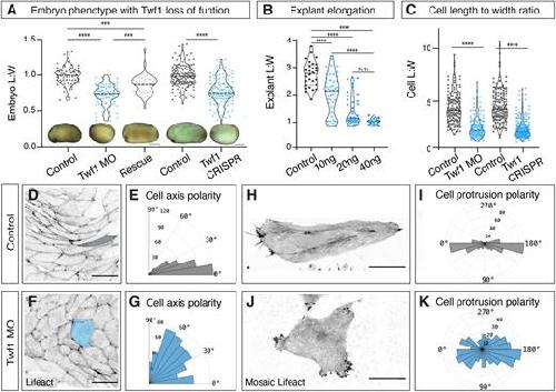 Figure 3. Twf1 is required for axis elongation and convergent extension. (A) Quantification of axis elongation (as length/width ratio) for control, Twf1 morphants, and Twf1 mRNA rescued embryos, along with sgRNA control and Twf1 crispants (inset images show representative examples; see more embryos in Fig. S3C), n=60 control embryos, n=88 morphant embryos, n=43 rescue embryos, n=155 sgRNA control, n=119 Twf1 Crispr. ***P<0.001; ****P<0.0001; n.s., not significant (Kruskal–Wallis test). Scale bars: 1 mm. (B) Quantification of explant elongation (as length/width ratio) for isolated DMZs from control and Twf1 morphant embryos. n=28, control; n=46, 10 ng; n=41, 20 ng; n=17, 40 ng. ****P<0.0001 for control vs 10 ng, 20 ng, 40 ng, n.s., not significant (P=0.0966) for 20 ng versus 40 ns (one-way Kruskal–Wallis test). (C) Quantification of cell shapes for control versus Twf1 morphant, and sgRNA control and Twf1 crispant DMZs. n=168 control cells from six embryos, n=156 Twf1 morphant cells from six embryos, n=169 sgRNA control cells from 11 embryos, n=294 Twf1 Crispr cells from 14 embryos, three experiments (representative images in Fig. S3C). ****P<0.0001 (Mann–Whitney U-test). Graphs in A–C are violin plots with the median being highlighted by a dashed line and quartiles with dotted lines. (D,E) Representative image (D) and rose diagram (E) showing quantification of cell axis polarity in control DMZ. Scale bar: 50 μm. (F,G) Representative image (F) and rose diagram (G) showing disrupted cell axis polarity in Twf1 morphant. Scale bar: 50 μm. E,G shows control vs Twf1 morphant, n=387 control cells from nine embryos, n=522 Twf1 morphant cells from 15 embryos. P<0.0001 (Kolmogorov–Smirnov test). (H) Confocal image of mosaically labeled cell in control DMZ. Scale bar: 10 μm. (I) Rose diagram showing the normal mediolateral polarization of lamellipodia in the control DMZ. (J) Confocal image of mosaically labeled cell in Twf1 morphant DMZ. Scale bar: 10 μm. (K) Rose diagram showing the disrupted mediolateral polarization of lamellipodia in the morphant. I,K show control vs Twf1 morphant, n=119 control protrusions from five embryos, n=194 Twf1 morphant protrusions from nine embryos. P<0.0001 (Kolmogorov–Smirnov test). |