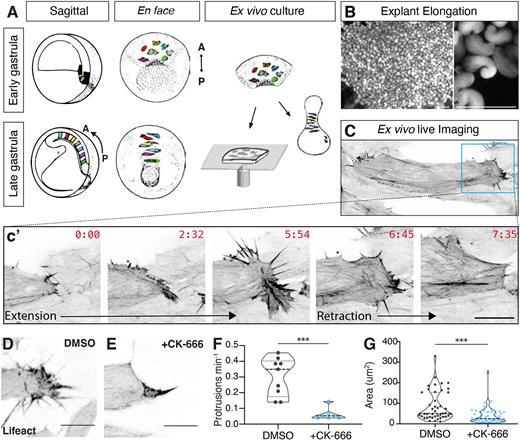 Figure 1. Lamellipodia in the Xenopus DMZ. (A) Schematic showing CE cell movements and DMZ explant method. Cells are unpolarized at the start of gastrulation and over time take on a bipolar polarity and intercalate to form a longer, narrower array. (B) Image showing elongated DMZ explants, close-up is shown at right. Scale bars: 1 mm. (C) Still from time-lapse confocal microscopy showing a single round of lamellipodial extension and retraction from the mediolateral end of a single DMZ cell. (D) DMSO does not affect DMZ lamellipodia. (E) Typical effect of CK-666 on DMZ lamellipodia. (F) Quantification of effects of CK-666 on protrusion frequency. n=9 DMSO protrusions from four embryos; n=7 CK666 protrusions from three embryos. ***P<0.001 for DMSO vs CK-666 (Mann–Whitney U-test). (G) Quantification of effects of CK-666 on protrusion size. n=43 DMSO-treated protrusions from four embryos, n=49 CK-666-treated protrusions from three embryos. ***P<0.001 for DMSO vs CK-666 (Mann–Whitney U-test). Graphs in F, G are violin plots with the median being highlighted by a dashed line and quartiles with dotted lines. Scale bars: 10 μm. |